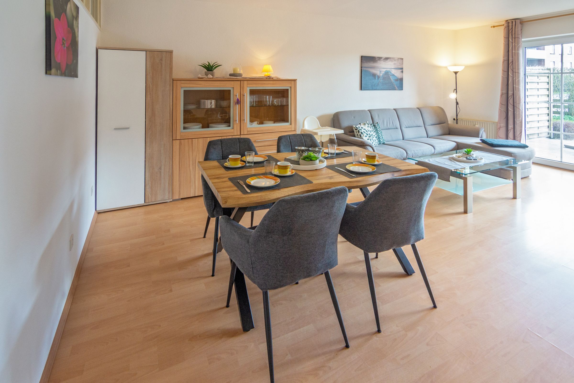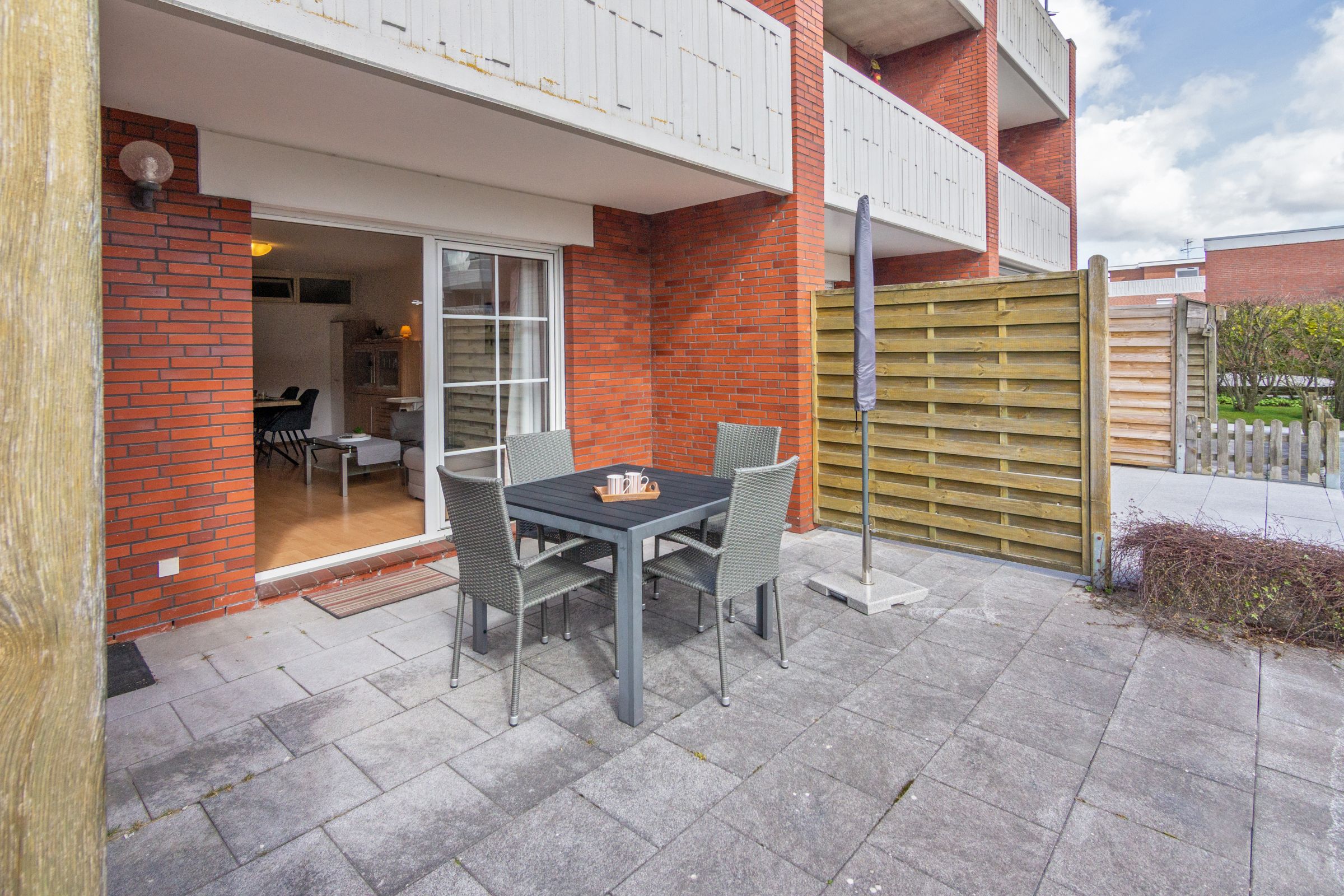 Die moderne Erdgeschosswohnung befindet sich in zentraler Lage, nur ca. 5 Fußminuten vom Ortskern und ca. 15 Minuten vom Strand entfernt. Sie bietet auf ca. 76 m² Platz für 4 Personen und verfügt über einen Wohnbereich mit integriertem Essplatz, eine voll ausgestattete Küche, zwei Schlafzimmer (eins mit Doppelbett, das andere mit zwei Einzelbetten) und ein Duschbad mit WC. Zur Wohnung gehört eine Terrasse und ein PKW-Stellplatz. Aus Rücksicht auf Allergiker sind Haustiere nicht erlaubt.